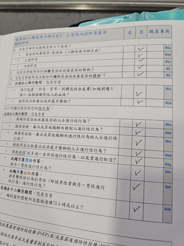 來到獻血站,第一步就是填寫健康問卷了。相比起上一次來的時候,從問「是否曾經有男男性行爲」,變成問「三個月內有男男無性行爲」了。